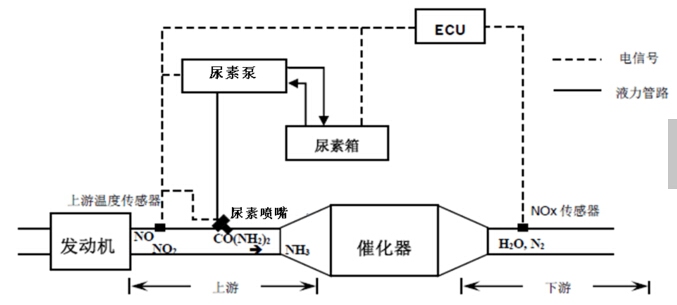 随着社会对于环境保护的意识不断加强,国家法规的愈来愈严格,从国四开始,单纯从发动机方面入手已经很难经济有效的达到法规要求,所以需要增加后处理系统。SCR(selective catalytic reduction),选择性催化还原是我国最广泛应用于柴油发动机的技术路线。应用SCR技术可以达到我国现行的国四、国五、京四及京五法规要求。SCR技术通过向排气中喷射尿素,尿素高温分解产生NH3,NH3可与废气中有害气体NOx发生反应,产生无害的N2,从而达到净化发动机尾气的效果。
